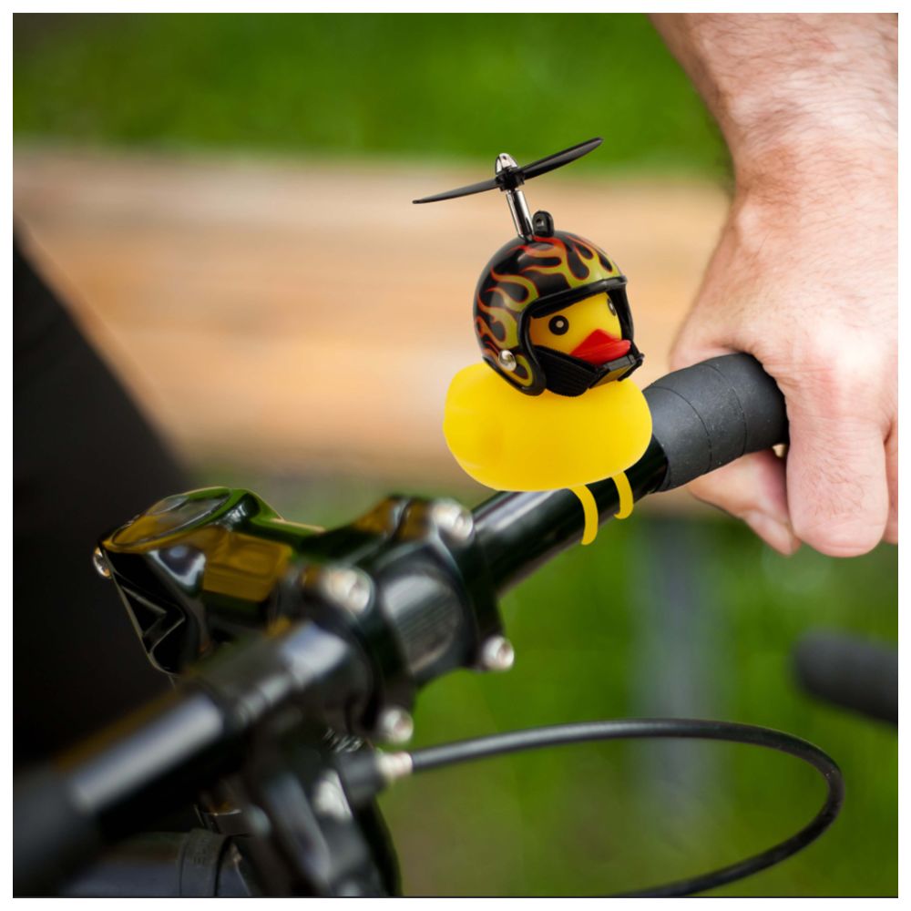 C’est un cadeau amusant pour les cyclistes qui non seulement veulent dire adieu à la sonnette conventionnelle et ennuyeuse et qui en plus aiment les canards qui font pouet-pouet. Quelle chance que dans ce cas, les deux se complètent de la plus belle des façons : notre adorable canard en plastique repose fièrement sur le guidon grâce à un support universel, pendant que la petite hélice fixée au casque hot rod tourne au gré du vent.