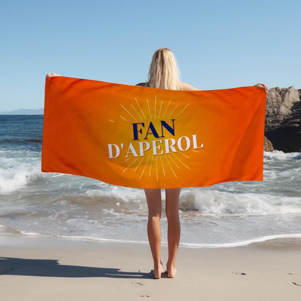 Découvrez notre serviette de plage au design pétillant familier et reconnaissable entre tous ! Elle est parfaite pour ceux et celles qui aiment l’été et qui aiment siroter cette boisson douce-amère. Avec deux lignes personnalisables, vous pouvez laisser libre cours à votre créativité : « Spritz O’Clock », « Fan d’Aperol » ou quelque chose de tout à fait personnel. Les couleurs vives et le design emblématique, combinés à votre propre texte, en font l’accessoire estival par excellence (et attirent tous les regards).